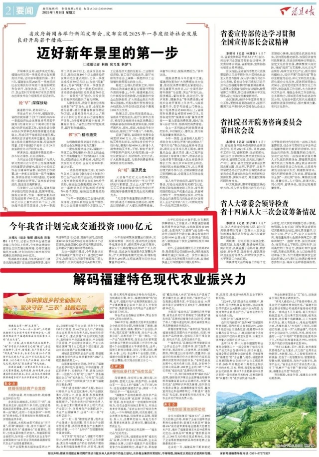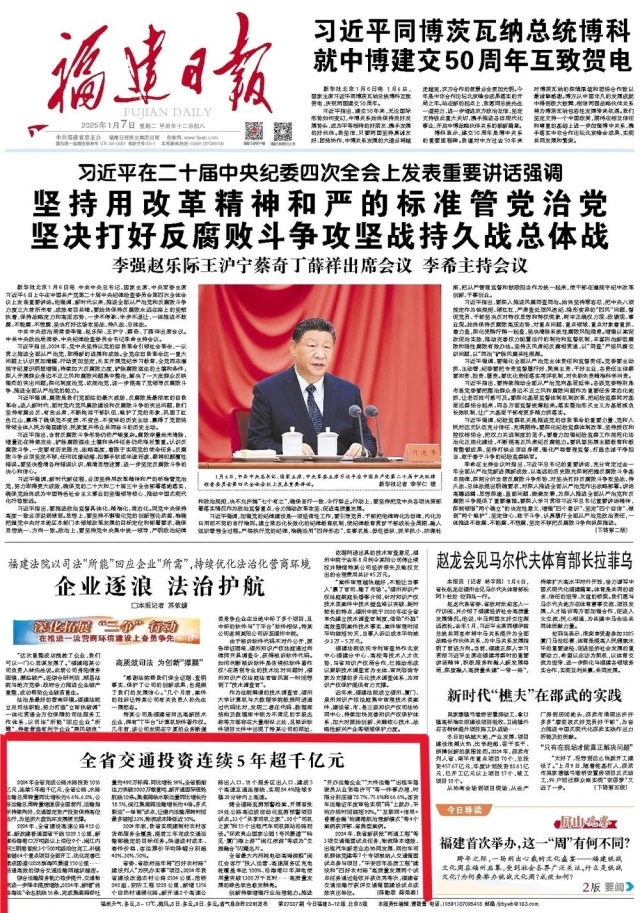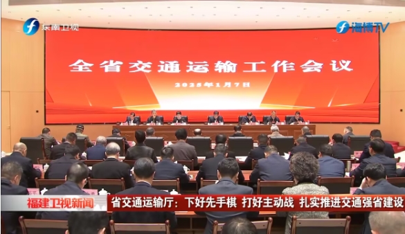1月7日,2025年全省交通運輸工作會議召開?!哆B續(xù)5年超千億元:福建省交通投資保持高位運行》《福建交通今年計劃完成投資1000億元》在新華網(wǎng)、人民日報、央視網(wǎng)、央廣網(wǎng)、學習強國、中國經(jīng)濟網(wǎng)、海峽網(wǎng)、福建日報、齊魯晚報等媒體報道。各大媒體全方位介紹省交通運輸廳在2024年為經(jīng)濟大盤筑牢發(fā)展硬支撐的成就,并聚焦我省2025年交通運輸工作計劃。 福建電視臺