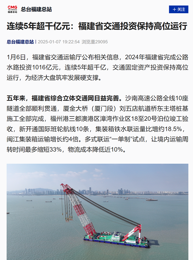 福建新聞聯(lián)播丨全省交通投資連續(xù)5年超千億元