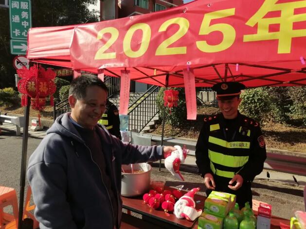 廈門高速執(zhí)法支隊聯(lián)合地方交通執(zhí)法、高速運營、消防、應(yīng)急等單位在同安收費站外廣場開展志愿服務(wù)活動,通過春節(jié)寄語、有獎競猜、寫春聯(lián)、寫福字等環(huán)節(jié),為司乘人員送出春聯(lián)、中國結(jié)、福字窗貼、蛇年吉祥物、愛心銀耳羹等暖心禮品。同時,執(zhí)法員聯(lián)合消防員向駕駛員講解冬季安全出行、處置汽車火情等知識,幫助對車況進行檢查、排除行車隱患,一同攜手共筑春運平安路。