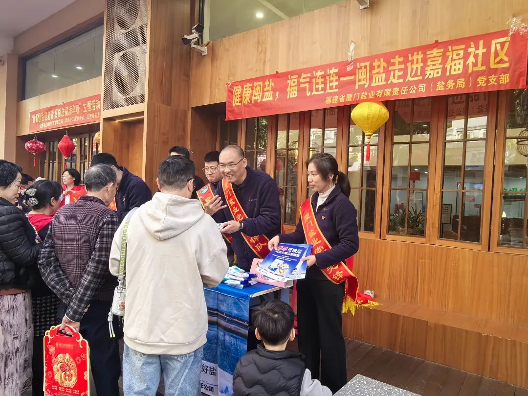 工作人員對鹽田工區(qū)、鹵水濃度等進行巡查抽查 墨香聯(lián)韻迎新春,科普傳情“鹽”暖心 廈門鹽業(yè)黨支部組織“鷺鹽先鋒”志愿者服務(wù)隊走進社區(qū)開展新春專場宣傳及迎春送?;顒?,為居民贈送鹽產(chǎn)品、紅包袋,普及科學(xué)食用鹽及低鈉鹽知識,營造平安、祥和、溫暖的社區(qū)節(jié)日氛圍。三明鹽業(yè)攜手市文聯(lián)前往11個縣、鄉(xiāng)鎮(zhèn)等開展了15場“遠山三人行”新春走基層主題宣傳活動,累計出動70人次,聚焦偏遠山區(qū),通過食鹽知識科普、走村入戶宣傳的方式,向村民傳遞了合理選鹽、健康用鹽理念。莆田鹽業(yè)聯(lián)合社區(qū)衛(wèi)生服務(wù)中心等單位走進社區(qū)開展文明實踐活動,向居民普及科學(xué)補碘、減鹽控鈉、假鹽辨別等健康用鹽、科學(xué)用鹽知識,為社區(qū)居民提供暖心服務(wù),共享健康、美味的人間“鹽”火。