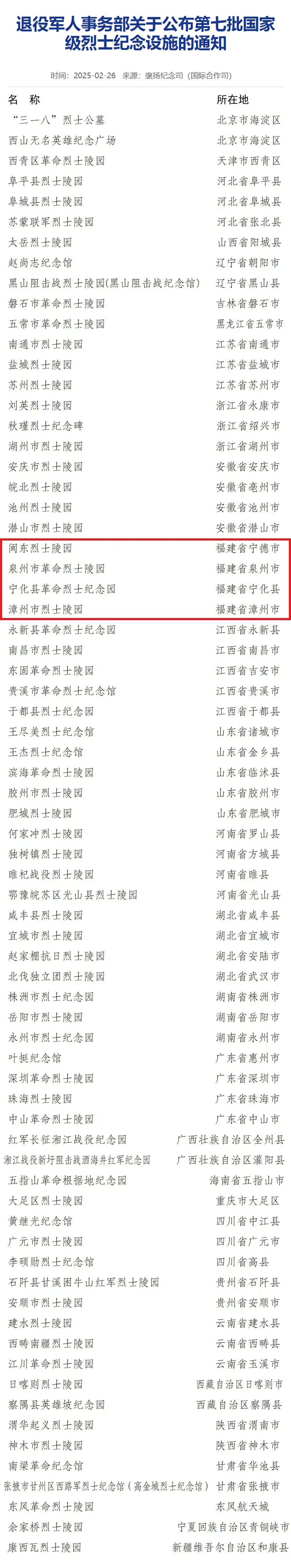 經(jīng)國(guó)務(wù)院批準(zhǔn),退役軍人事務(wù)部2025年2月25日發(fā)布《關(guān)于公布第七批國(guó)家級(jí)烈士紀(jì)念設(shè)施的通知》,公布第七批71處國(guó)家級(jí)烈士紀(jì)念設(shè)施名單。我省閩東烈士陵園、泉州市革命烈士陵園、寧化縣革命烈士紀(jì)念園、漳州市烈士陵園4處省級(jí)烈士陵園升級(jí)為國(guó)家級(jí)烈士紀(jì)念設(shè)施。至此,我省國(guó)家級(jí)烈士紀(jì)念設(shè)施已達(dá)12處,實(shí)現(xiàn)各設(shè)區(qū)市都有國(guó)家級(jí)烈士紀(jì)念設(shè)施的目標(biāo),這是我省各級(jí)大力推動(dòng)烈士褒揚(yáng)工作高質(zhì)量發(fā)展的又一實(shí)踐成果。 下一步,省退役軍人事務(wù)廳將指導(dǎo)新升級(jí)的4家國(guó)家級(jí)烈士紀(jì)念設(shè)施保護(hù)管理單位高標(biāo)準(zhǔn)設(shè)立保護(hù)標(biāo)識(shí),提升展陳水平,充分發(fā)揮國(guó)家級(jí)烈士紀(jì)念設(shè)施宣教示范引領(lǐng)作用,講好八閩英烈故事,傳承弘揚(yáng)紅色文化,推動(dòng)全社會(huì)崇尚英雄、緬懷先烈、爭(zhēng)做先鋒,為奮力推進(jìn)中國(guó)式現(xiàn)代化福建實(shí)踐凝聚強(qiáng)大精神力量。 4處烈士紀(jì)念設(shè)施簡(jiǎn)介 閩東烈士陵園 地址:寧德市福安市城北街道甲杯山公園路13號(hào) 1955年8月,原福安行署和福安縣人民政府撥款營(yíng)建閩東烈士陵園。1970年,陵園被列為省級(jí)烈士紀(jì)念設(shè)施保護(hù)單位。2004年新建閩東烈士陵園大門(mén)等,2006年建成阮英平半身銅像一尊,2021年投資建設(shè)閩東烈士紀(jì)念室,2023年建成烈士英名墻。陵園隸屬福安市退役軍人事務(wù)局,保護(hù)范圍8805.76平方米,由紀(jì)念碑、烈士墓、阮英平烈士雕像、紀(jì)念廣場(chǎng)、烈士紀(jì)念室、烈士英名墻組成。其中烈士墓區(qū)內(nèi)安葬290名烈士。 閩東具有光榮的革命斗爭(zhēng)傳統(tǒng),在革命歷史時(shí)期,發(fā)生了具有代表性的蘭田暴動(dòng)、賽岐暴動(dòng)等。據(jù)統(tǒng)計(jì),閩東在各個(gè)時(shí)期犧牲的有名烈士共7630名,同時(shí)還有很多無(wú)名烈士長(zhǎng)眠在閩東這片紅色土地。 閩東烈士陵園是省級(jí)重點(diǎn)烈士紀(jì)念建筑物保護(hù)單位、福建省黨史教育基地、寧德市愛(ài)國(guó)主義教育基地、寧德市文明行業(yè)創(chuàng)建工作示范點(diǎn)。閩東烈士陵園每年開(kāi)展多樣的烈士紀(jì)念活動(dòng),對(duì)廣大干部群眾、青少年學(xué)生進(jìn)行革命傳統(tǒng)教育和愛(ài)國(guó)主義教育。同時(shí)通過(guò)組織老黨員和烈士后人進(jìn)校園為青少年講述烈士英雄事跡、培育紅色志愿者講解員、聯(lián)合兄弟單位開(kāi)展進(jìn)軍營(yíng)宣講等活動(dòng),廣泛開(kāi)展宣傳教育。 泉州市革命烈士陵園 地址:泉州市豐澤區(qū)城東街道東星社區(qū)仕公嶺 泉州市革命烈士陵園建于1990年。1996年4月,革命烈士紀(jì)念碑落成揭碑。1998年7月,烈士紀(jì)念館主體建筑竣工。2023年新增烈士英名墻。泉州市革命烈士陵園隸屬泉州市革命烈士陵園保護(hù)中心,保護(hù)范圍約2.35萬(wàn)平方米。 泉州市革命烈士紀(jì)念碑高26.12米,寬3.57米,主碑正面由彭沖題詞“革命烈士永垂不朽”,背面由項(xiàng)南題詞“功垂千秋,氣貫長(zhǎng)虹”。 泉州是紅色僑鄉(xiāng),具有光榮的革命斗爭(zhēng)傳統(tǒng),自1926年12月中共泉州地方黨組織成立以來(lái),陳平山、董云閣、李南金、李剛、李子芳等無(wú)數(shù)泉州兒女為民族解放和共和國(guó)建設(shè)事業(yè)英勇獻(xiàn)身。據(jù)統(tǒng)計(jì),泉州在各個(gè)時(shí)期犧牲的有名烈士共1675名,同時(shí)還有很多無(wú)名英烈長(zhǎng)眠在泉山晉水,他們用熱血和生命鑄就了燭照千秋的歷史豐碑。 泉州市革命烈士陵園保護(hù)中心是全國(guó)退役軍人工作模范單位。泉州市革命烈士陵園是福建省首批黨史教育基地、省級(jí)重點(diǎn)烈士紀(jì)念建筑物保護(hù)單位,也是泉州市黨史教育基地、愛(ài)國(guó)主義教育基地、國(guó)防教育基地、泉州市機(jī)關(guān)黨組織主題黨日教育基地、中小學(xué)生研學(xué)實(shí)踐教育基地、文物保護(hù)單位。每逢清明和重要紀(jì)念日,陵園都精心組織祭掃紀(jì)念活動(dòng)。陵園與高校共育大學(xué)生紅色志愿講解員,共建實(shí)踐教育基地,同時(shí)積極收集整理烈士事跡、烈士遺物,拍攝英烈故事微視頻,聘請(qǐng)黨史專(zhuān)家擔(dān)任研究員,走出烈士陵園進(jìn)行巡展、宣講。據(jù)不完全統(tǒng)計(jì),每年前來(lái)陵園祭掃者約10萬(wàn)余人次。 寧化縣革命烈士紀(jì)念園 地址:三明市寧化縣翠江鎮(zhèn)城西路71號(hào) 寧化縣革命烈士紀(jì)念園始建于1977年,2006年、2013年曾兩次修繕改造。紀(jì)念園保護(hù)范圍18754.49平方米,建有寧化縣革命烈士紀(jì)念館、革命烈士紀(jì)念碑、毛澤東《如夢(mèng)令·元旦》紀(jì)念銅像、《軍號(hào)嘹亮》石雕等,是園林式革命紀(jì)念設(shè)施。 寧化有優(yōu)良的革命傳統(tǒng),是中央蘇區(qū)的21個(gè)基點(diǎn)縣之一。毛澤東、朱德、周恩來(lái)、彭德懷等都曾在寧化這片紅色土地進(jìn)行過(guò)重要的革命實(shí)踐。1929年至1934年間,全縣參加紅軍16000多人,參加長(zhǎng)征6000多人。寧化蘇區(qū)在人力、財