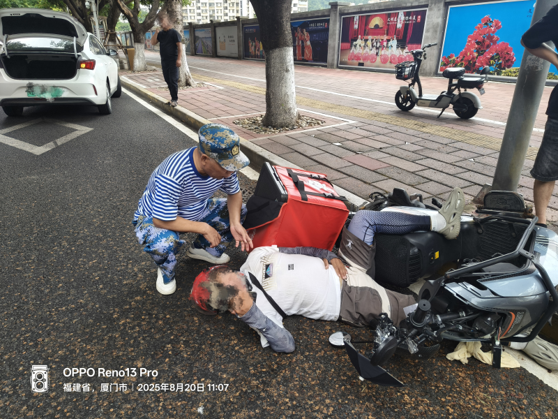 廈門:外賣小哥倒地,七旬老兵出手相助