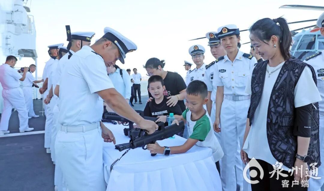 8月28日下午4時(shí)許,海軍“絲路方舟”號(hào)醫(yī)院船停靠泉州港。在接下來(lái)的幾天時(shí)間里,“絲路方舟”號(hào)醫(yī)院船將與共建城市泉州開(kāi)啟“城艦永相依 共續(xù)海絲情”一系列共建活動(dòng)。(陳小陽(yáng) 攝) 當(dāng)天下午4時(shí)許,船身懸掛著“愛(ài)我人民愛(ài)我軍 愛(ài)我家鄉(xiāng)愛(ài)我艦”“向家鄉(xiāng)親人問(wèn)好”等紅色橫幅的海軍“絲路方舟”號(hào)醫(yī)院船踏浪而來(lái),緩緩駛近碼頭。岸上,激昂的《歡迎進(jìn)行曲》響起,一場(chǎng)準(zhǔn)備已久、熱烈歡快的歡迎儀式瞬間被“引燃”。泉州黨政機(jī)關(guān)有關(guān)領(lǐng)導(dǎo),泉州軍分區(qū)、泉州市退役軍人事務(wù)局等相關(guān)部門(mén)干部以及各界群眾代表等近200人揮舞著旗幟,熱烈歡呼,以飽滿熱情共同迎接“絲路方舟”??咳莞圻@一歷史時(shí)刻。 歡迎儀式結(jié)束后,軍地領(lǐng)導(dǎo)及各界群眾受邀登艦參觀,在官兵的指引下,走進(jìn)艙室,參觀榮譽(yù)墻、手術(shù)室、診療室、駕駛室等,深入了解海軍“絲路方舟”號(hào)醫(yī)院船入列以來(lái)的發(fā)展歷程和壯美航跡,近距離感受這艘“大白船”的獨(dú)特魅力。