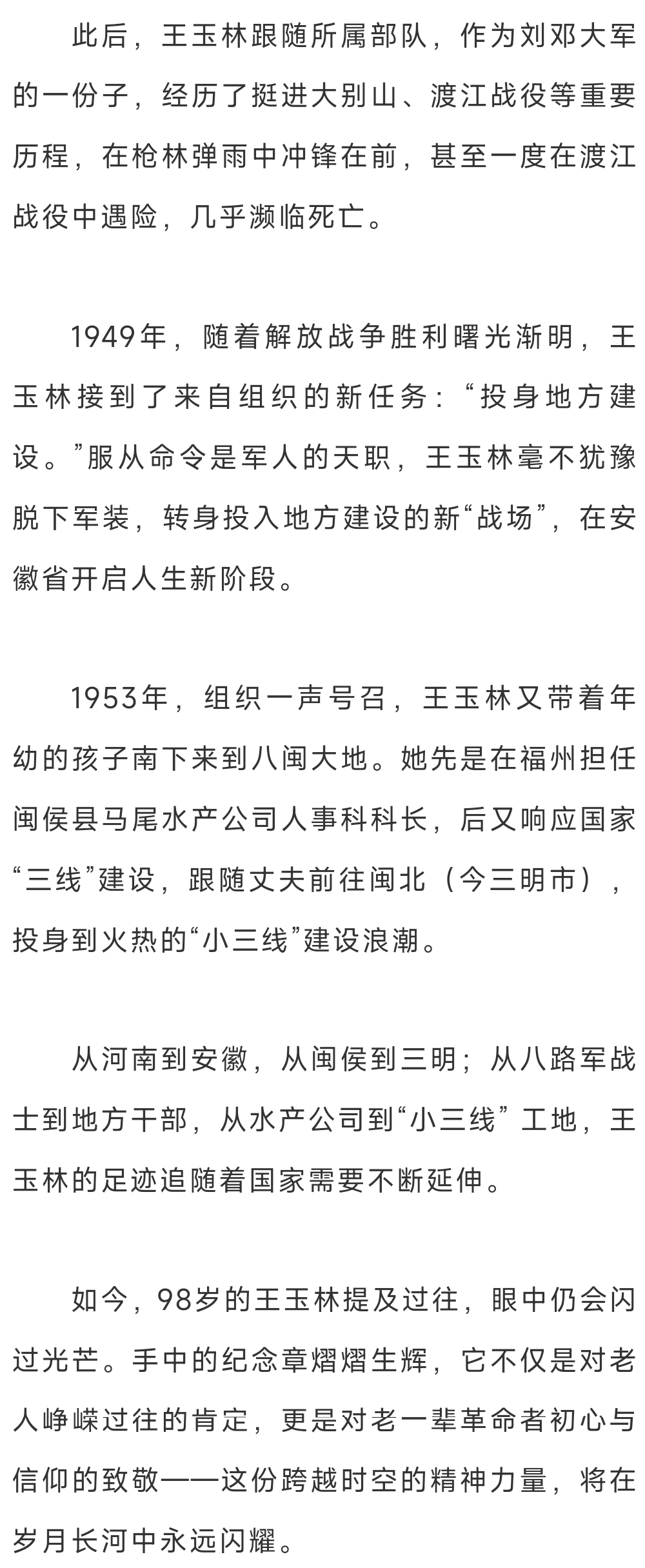 編者按: 為紀念中國人民抗日戰(zhàn)爭暨世界反法西斯戰(zhàn)爭勝利80周年,深入挖掘抗戰(zhàn)老兵事跡,傳承紅色基因,省退役軍人事務(wù)廳聯(lián)合各地市退役軍人事務(wù)部門開展走進抗戰(zhàn)老兵家庭,重溫抗戰(zhàn)歷史系列活動。廳官網(wǎng)官微開辟“致敬抗戰(zhàn)老兵”專欄對此進行系列宣傳,今日推出《98歲八路軍女戰(zhàn)士王玉林,收到這枚金燦燦的紀念章》的故事。 日前,一枚承載著敬意的“中國人民抗日戰(zhàn)爭勝利80周年”紀念章,由閩侯縣農(nóng)業(yè)農(nóng)村局工作人員帶到三明市,送到了今年98歲高齡,曾在閩侯縣工作生活過的八路軍女戰(zhàn)士王玉林家中。