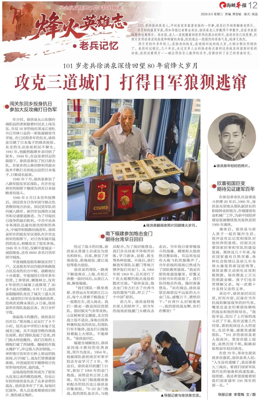 徐洪泉年輕時的照片 平度城既是膠東解放區(qū)的門戶,又是膠東軍民向膠濟鐵路敵占區(qū)反攻的后方中樞,戰(zhàn)略地位十分重要。平度城經日偽軍多年經營,工事堅固,碉堡林立,僅有4華里的古城墻上就修筑了30多個高大的碉堡。9月7日,徐洪泉跟隨部隊攻克了城關三道大關卡,城里的日軍倉皇南逃到高密。經兩次勸降未果后,9日夜,徐洪泉所在部隊發(fā)起總攻,次日全殲守敵。 談起戰(zhàn)斗的激烈,徐洪泉歷歷在目:“那天晚上足足打了8個小時,駐在縣中學的日本鬼子見城關已破,天不亮就奪路向南逃往高密。我們部隊發(fā)起了總攻,西門炮火特別激烈,我們自制的土鋼炮打破了西城樓。爆破組在炮火掩護下,沖過敵人的封鎖線,一舉炸毀日偽軍在石橋上架設的鐵絲網,打開城門。戰(zhàn)友們冒著滾滾濃煙,沖進城里用手榴彈炸得日偽軍死傷慘重,四處逃竄。” 這場戰(zhàn)役的勝利成為了膠東大反攻以來的模范戰(zhàn)例,但也讓年輕的徐洪泉失去了眾多親密的戰(zhàn)友。徐洪泉幸存了下來,每每回憶戰(zhàn)爭,老人總是看著那些舊照片,既傷感又愧疚。 南下福建參加炮擊金門 期待臺灣早日回歸 經過了戰(zhàn)斗的歷練,徐洪泉從普通士兵成長為班長和排長。后來,參加了濟南戰(zhàn)役、淮海戰(zhàn)役、渡江戰(zhàn)役等重大戰(zhàn)役。 徐洪泉的部隊一路南下解放南京、上海,在松江休整一段時間后,從浙江入閩,解放福建。 “我們部隊一路乘漁船、乘貨運火車到浙江江山后,每個人背著干糧袋走了一星期左右,進入閩北。我們一路走一路追國民黨部隊,那時候天氣非常炎熱,山區(qū)樹林里又潮濕,北方的戰(zhàn)士很不適應,身體出現各種暑熱發(fā)炎的狀況,但部隊行軍不能停,戰(zhàn)友們只能堅持著跟上大部隊,不能掉隊?!毙旌槿貞?。 福建全域解放后,徐洪泉因作戰(zhàn)英勇、表現突出,晉升為連長。1954年,他被選派至南京軍事學院進行了為期三年的專業(yè)學習。畢業(yè)后,徐洪泉回到廈門31軍,參加了1958年的金門炮戰(zhàn)。雖然沒有正面上戰(zhàn)場,但為金門炮戰(zhàn)做準備和配合的經歷也讓徐洪泉印象深刻。“'8·23金門炮戰(zhàn)',我的部隊是步兵,與炮兵配合,為了戰(zhàn)時能登島,我們步兵晝夜不停艱苦訓練,學習游泳、劃船、救生等各種技能。開戰(zhàn)后,我們解放軍部隊從廈門等地萬彈齊發(fā)打向金門,從1958年到1959年,總共進行了7次大規(guī)模的炮擊戰(zhàn)役和數次空戰(zhàn)。”徐洪泉說,炮擊金門有力打擊了臺灣當局的囂張氣焰,捍衛(wèi)了一個中國原則。 前幾年,徐洪泉特地在家人的陪伴下,到當年的戰(zhàn)地前線廈門大嶝島走訪,當年他日夜穿梭戰(zhàn)斗的戰(zhàn)壕、碉堡和大炮依然完整如故,耳邊再也沒有大炮飛機的轟隆聲了,當年前線的戰(zhàn)場已然成為國防教育基地?!拔易咴谀切┑氐缿?zhàn)壕里,好像又回到當年的戰(zhàn)場了,我們協同炮兵作戰(zhàn),隨時準備登島?!闭驹诤_?,徐洪泉望見海那邊不遠處的大小金門島,感慨萬千。 欣喜祖國巨變 期待見證建軍百年 在參加革命隊伍奮勇戰(zhàn)斗拼搏20年后,1965年,徐洪泉光榮地從部隊副團長的職級轉業(yè)到地方,在福建省農業(yè)機械廠工作,為新中國經濟建設發(fā)展繼續(xù)發(fā)光發(fā)熱直到1985年離休。 離休后,徐洪泉與家人孩子一起在福州生活,他并沒有忘記黨和部隊對他培養(yǎng)的恩情,時刻關注著國家時事和軍隊的建設發(fā)展。離休這幾十年來,每次國家遇有自然災難、安全事故、突發(fā)公共事件,徐洪泉都主動到社區(qū)里積極捐款,每次都是上萬元的捐款金額。孩子們也非常理解父親,每一次都十分支持父親的義舉。 采訪中,徐洪泉時而沉思,時而興奮,沉浸在當年抗戰(zhàn)和解放戰(zhàn)爭的時代里,嘴里總是念叨著那些犧牲的戰(zhàn)友和他的指導員?!拔液苄疫\,經歷了上百場的戰(zhàn)斗活了下來,現在還能幾代同堂,看到祖國這么大的變化,生活幸福,感謝黨感謝部隊。”101歲的徐洪泉老人很高興,笑容在臉上綻放,雖然歷經千帆,眼睛卻依然如年輕時清亮。 在黨79年,革命生涯榮獲多次嘉獎,徐洪泉老人說:“看到我們國家軍隊現代化的裝備和高速發(fā)展,我的人生沒有遺憾了。我還希望我能看到我們國家建軍100周年的那一天?!?/p>