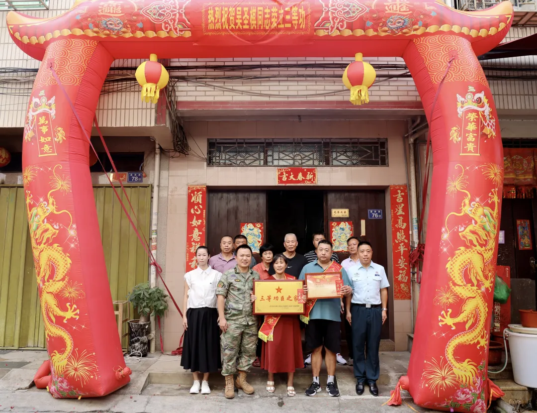 送喜報(bào)活動(dòng)結(jié)束后,軍地領(lǐng)導(dǎo)與蔡茂貴家屬親切圍坐在一起,詳細(xì)了解了蔡茂貴和家屬的工作、生活情況。蔡茂貴的父親感動(dòng)萬(wàn)分,并表示他們作為軍人的后方,會(huì)一如既往地做好孩子的堅(jiān)強(qiáng)后盾,支持、鼓勵(lì)蔡茂貴立足本職崗位,再接再厲,為國(guó)防和軍隊(duì)建設(shè)作出更大貢獻(xiàn)。 南安市 吳圣棋榮立三等功 9月11日,南安市人武部政工科、南安市退役軍人事務(wù)局、官橋鎮(zhèn)武裝部、鎮(zhèn)退役軍人服務(wù)站和村“兩委”等多個(gè)單位負(fù)責(zé)人組成的慰問(wèn)組,為官橋鎮(zhèn)金莊社區(qū)榮立三等功的現(xiàn)役軍人吳圣棋家庭送上立功喜報(bào),共同見(jiàn)證這一榮耀時(shí)刻。