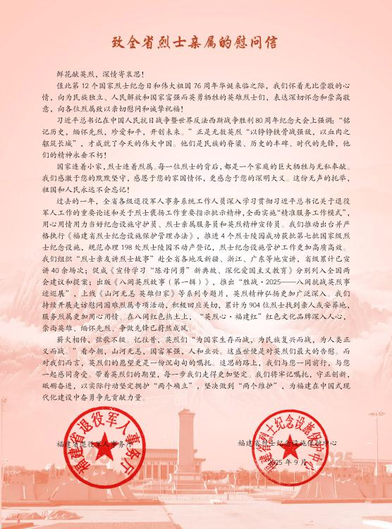 近日,一封飽含尊崇與深情的慰問信,以特快專遞或者志愿者上門送達(dá)的形式,送到全省烈士親屬的手中。這是省退役軍人事務(wù)廳在今年“9·30”烈士紀(jì)念日和新中國76周年華誕來臨之際,連續(xù)第3年向全省烈士親屬送上慰問信。