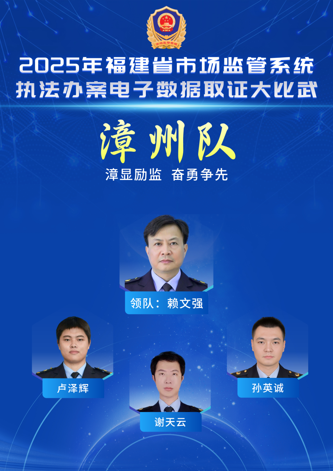 口號(hào):廈門市監(jiān),一鷺爭(zhēng)先 成員簡(jiǎn)介 洪志新(領(lǐng)隊(duì)),廈門市市場(chǎng)監(jiān)管局黨組成員、副局長(zhǎng)、市知識(shí)產(chǎn)權(quán)局局長(zhǎng)。 沈瑋煌,男,現(xiàn)任廈門市思明區(qū)市場(chǎng)監(jiān)管局鼓浪嶼市場(chǎng)監(jiān)管所四級(jí)主任科員。從事市場(chǎng)監(jiān)管工作4年。先后在注冊(cè)、執(zhí)法、監(jiān)管等多個(gè)崗位工作,有多年的基層監(jiān)管執(zhí)法經(jīng)驗(yàn)。2021年參加首屆福建省市場(chǎng)監(jiān)管系統(tǒng)執(zhí)法辦案電子數(shù)據(jù)取證大比武,獲團(tuán)體一等獎(jiǎng)、個(gè)人二等獎(jiǎng);2023年參加福建省市場(chǎng)監(jiān)管系統(tǒng)執(zhí)法辦案電子數(shù)據(jù)取證大比武,獲團(tuán)體銀獎(jiǎng)、個(gè)人銀獎(jiǎng)。 林楨,女,現(xiàn)任廈門市翔安區(qū)市場(chǎng)監(jiān)管局執(zhí)法稽查科一級(jí)科員,從事市場(chǎng)監(jiān)管工作2年。主要從事基層執(zhí)法辦案,獲2024年參加福建省市場(chǎng)監(jiān)管系統(tǒng)執(zhí)法稽查職業(yè)技能競(jìng)賽團(tuán)體金獎(jiǎng)。 謝瑋銘,男,現(xiàn)任廈門市思明區(qū)市場(chǎng)監(jiān)管局執(zhí)法稽查科一級(jí)科員,從事市場(chǎng)監(jiān)管工作2年。主要從事基層執(zhí)法辦案。 漳州代表隊(duì)