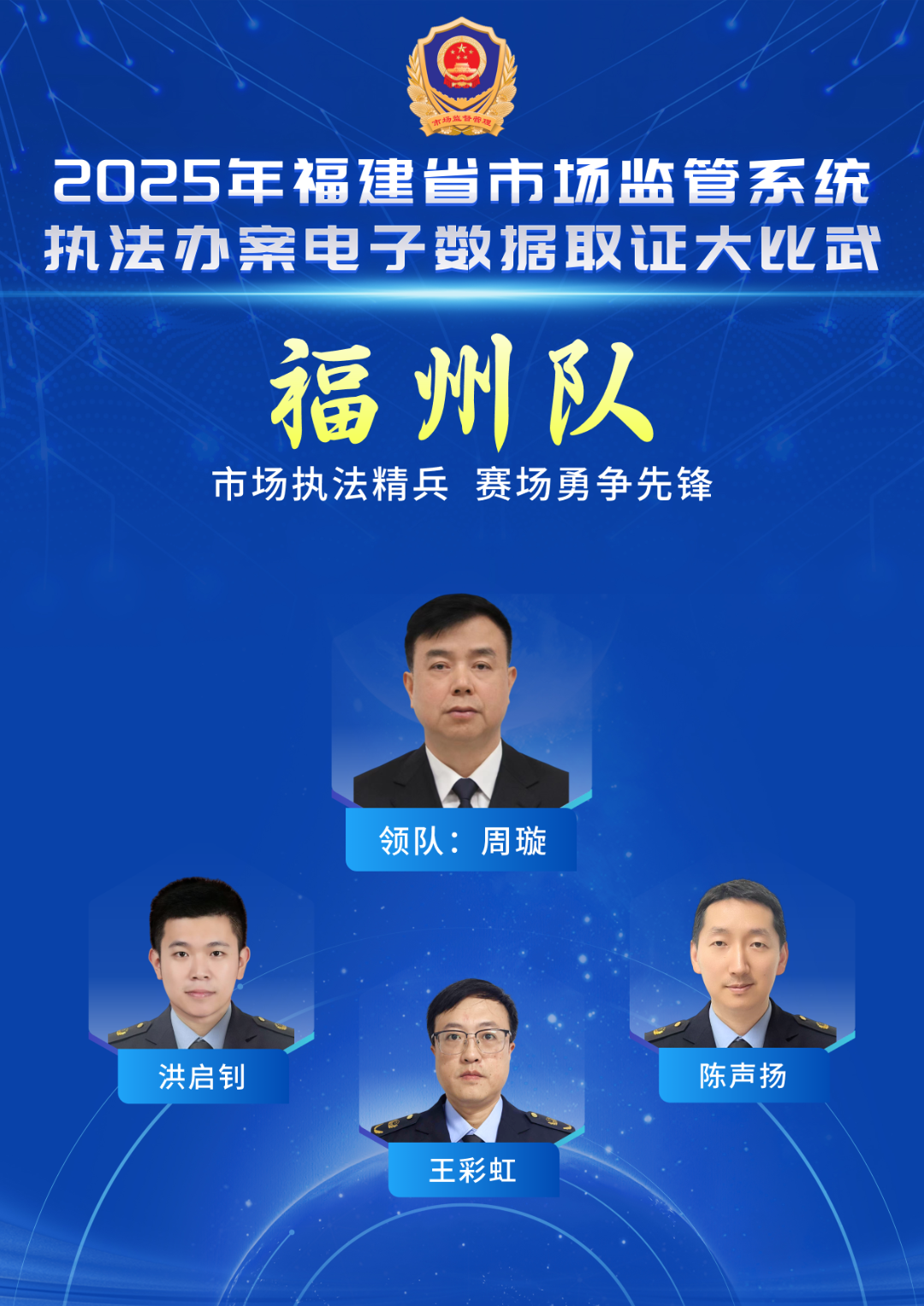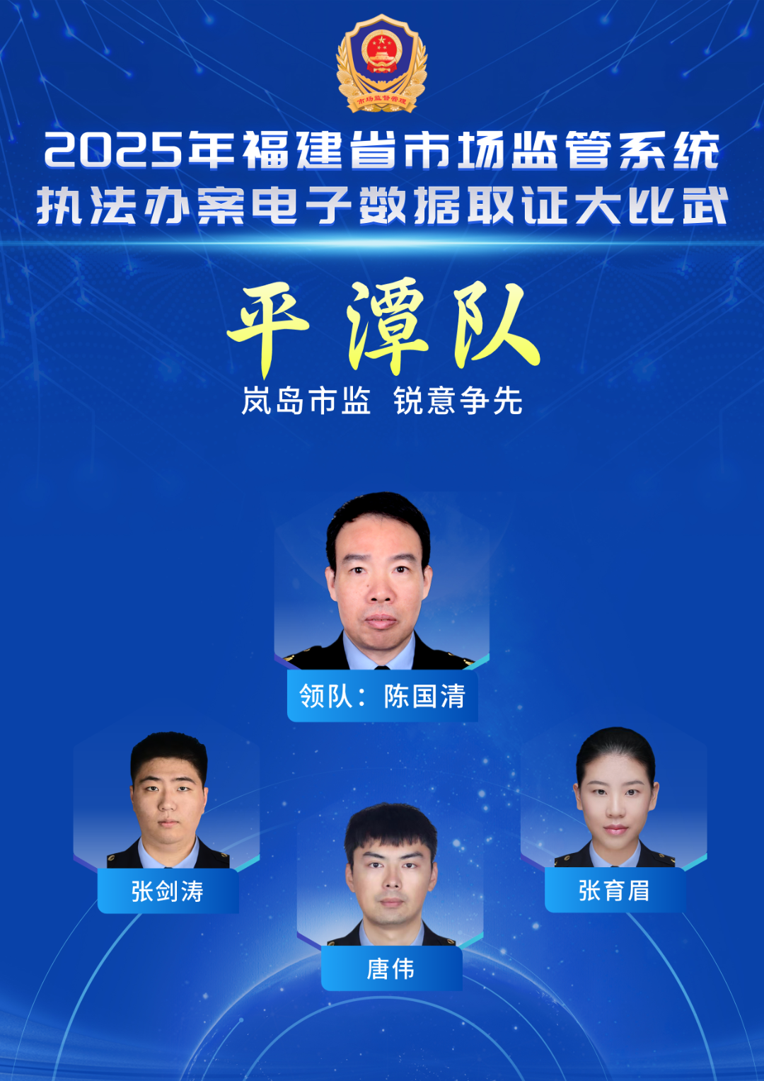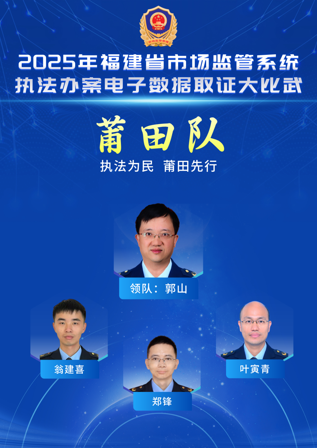 口號(hào):執(zhí)法為民,莆田先行 成員簡(jiǎn)介 郭山(領(lǐng)隊(duì)),莆田市市場(chǎng)監(jiān)管綜合執(zhí)法支隊(duì)支隊(duì)長(zhǎng)。 翁建喜,男,現(xiàn)任莆田市市場(chǎng)監(jiān)管綜合執(zhí)法支隊(duì)科員,從事市場(chǎng)監(jiān)管工作12年。在查處網(wǎng)絡(luò)交易、反不正當(dāng)競(jìng)爭(zhēng)等類型違法行為具有一定的經(jīng)驗(yàn)。 鄭鋒,男,現(xiàn)任莆田市市場(chǎng)監(jiān)管局執(zhí)法支隊(duì)科員,從事一線執(zhí)法工作10年,具有較豐富的執(zhí)法辦案經(jīng)驗(yàn)。 葉寅青,男,現(xiàn)任莆田市市場(chǎng)監(jiān)管綜合執(zhí)法支隊(duì)科員。從事一線執(zhí)法工作7年,積累了一定的執(zhí)法工作經(jīng)驗(yàn)。 南平代表隊(duì)