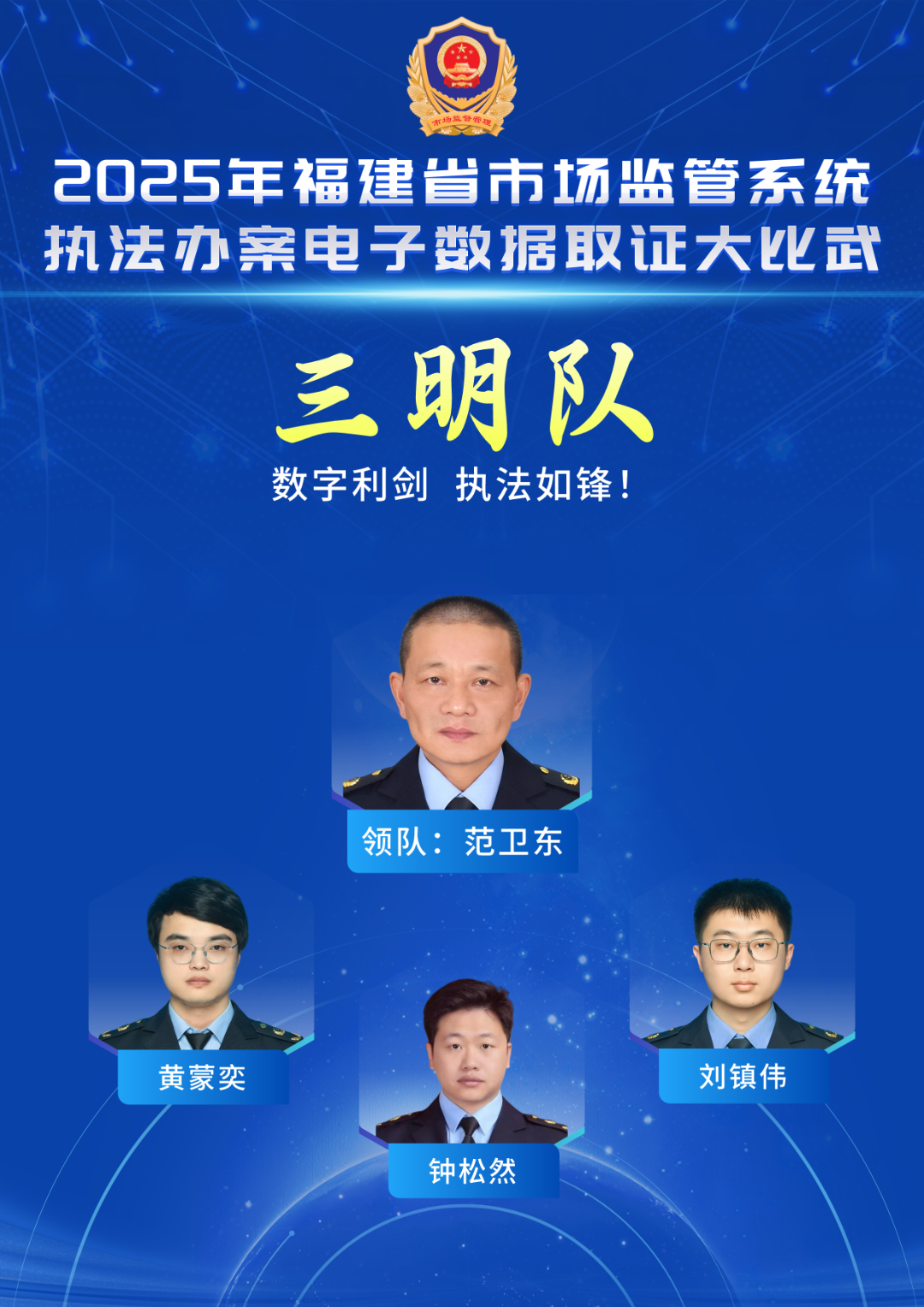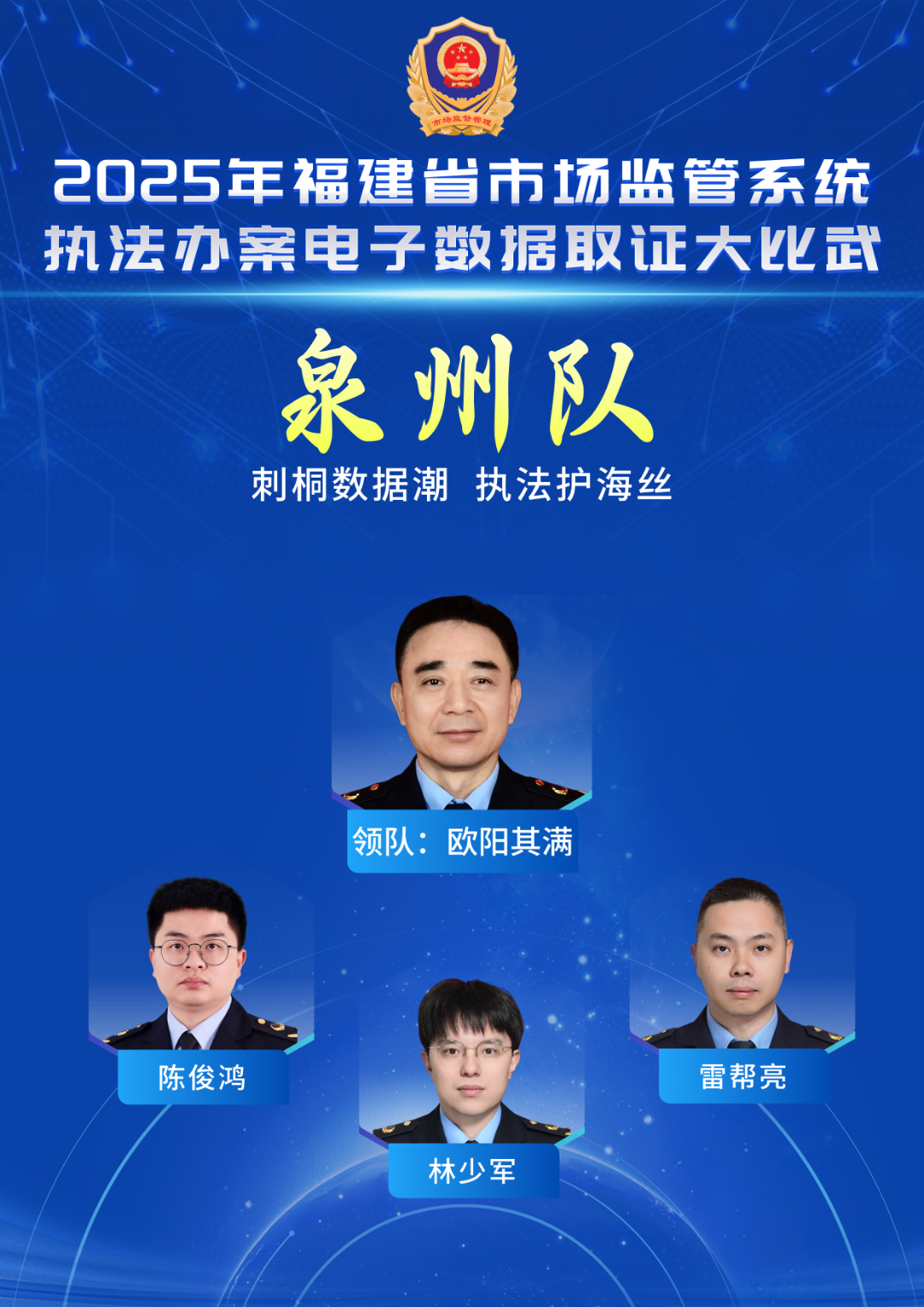 口號(hào):刺桐數(shù)據(jù)潮,執(zhí)法護(hù)海絲 成員簡(jiǎn)介 歐陽(yáng)其滿(領(lǐng)隊(duì)),泉州市市場(chǎng)監(jiān)管局黨組成員、副局長(zhǎng)。 陳俊鴻,男,現(xiàn)任職于泉州南安市市場(chǎng)監(jiān)管局九都鎮(zhèn)市場(chǎng)監(jiān)管所副所長(zhǎng),從事投訴舉報(bào)核查處置、案件查辦等一線監(jiān)管執(zhí)法工作。2024年代表泉州市市場(chǎng)監(jiān)管局參加福建省市場(chǎng)監(jiān)管系統(tǒng)執(zhí)法稽查職業(yè)技能競(jìng)賽,榮獲個(gè)人優(yōu)勝獎(jiǎng)。 林少軍,男,現(xiàn)任泉州晉江市市場(chǎng)監(jiān)管局特安科副科長(zhǎng),善于發(fā)揮專業(yè)優(yōu)勢(shì),有效將計(jì)算機(jī)專業(yè)背景與市場(chǎng)監(jiān)管業(yè)務(wù)需求相結(jié)合。 雷幫亮,男,現(xiàn)任泉州晉江市市場(chǎng)監(jiān)管局羅山市場(chǎng)監(jiān)管所副所長(zhǎng),從事監(jiān)管及執(zhí)法工作。獲得2024年福建省市場(chǎng)監(jiān)管系統(tǒng)執(zhí)法稽查職業(yè)技能競(jìng)賽團(tuán)體銀獎(jiǎng)、個(gè)人優(yōu)勝獎(jiǎng)。 三明代表隊(duì)