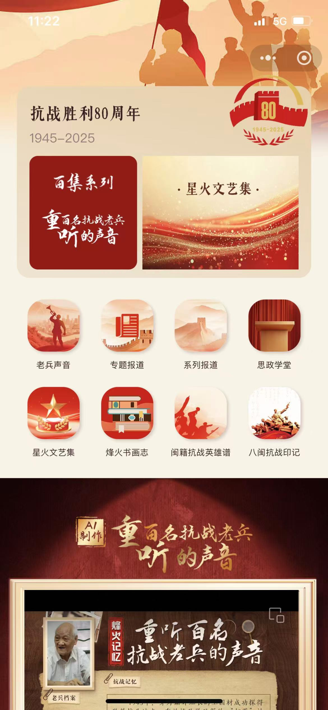 平臺(tái)以數(shù)字化形式系統(tǒng)整合并呈現(xiàn)我省抗戰(zhàn)歷史珍貴資源,以聲音、圖像、文字與書(shū)畫(huà)等載體,打造可感知、可觸摸、可傳承的抗戰(zhàn)記憶數(shù)字空間,通過(guò)系統(tǒng)構(gòu)以“重聽(tīng)百名抗戰(zhàn)老兵的聲音”“閩籍抗戰(zhàn)英雄譜”“八閩抗戰(zhàn)印記”“烽火書(shū)畫(huà)志”等為核心的立體化內(nèi)容矩陣,生動(dòng)再現(xiàn)福建軍民在抗戰(zhàn)歲月中的英勇事跡與不朽貢獻(xiàn),為廣大用戶打造了一個(gè)可隨時(shí)隨地訪問(wèn)、具有深刻教育意義的“掌上抗戰(zhàn)博物館”。 平臺(tái)自上線試運(yùn)行以來(lái),訪問(wèn)量持續(xù)攀升,社會(huì)反響熱烈。不僅得到學(xué)習(xí)強(qiáng)國(guó)、新福建等主流平臺(tái)的重點(diǎn)推薦,更在廣大干部群眾、退役軍人、青年學(xué)生及社會(huì)各界中引發(fā)積極評(píng)價(jià)和情感共鳴,有效拓展了愛(ài)國(guó)主義教育的覆蓋面和影響力,成為弘揚(yáng)偉大抗戰(zhàn)精神的重要數(shù)字化載體。 誠(chéng)邀社會(huì)各界人士掃碼登錄“永不消逝的抗戰(zhàn)記憶”小程序,聆聽(tīng)歷史回響,感悟抗戰(zhàn)精神,共同守護(hù)這份珍貴的民族記憶!