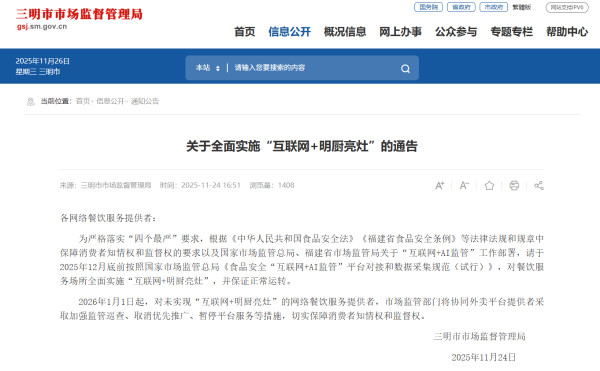 近日,三明市市場監(jiān)督管理局發(fā)布通告,要求網(wǎng)絡餐飲服務提供者于2025年12月底前按照國家市場監(jiān)管總局《食品安全“互聯(lián)網(wǎng)+AI監(jiān)管”平臺對接和數(shù)據(jù)采集規(guī)范(試行)》,對餐飲服務場所全面實施“互聯(lián)網(wǎng)+明廚亮灶”,并保證正常運轉(zhuǎn)。 2026年1月1日起,對未實現(xiàn)“互聯(lián)網(wǎng)+明廚亮灶”的網(wǎng)絡餐飲服務提供者,市場監(jiān)管部門將協(xié)同外賣平臺提供者采取加強監(jiān)管巡查、取消優(yōu)先推廣、暫停平臺服務等措施,切實保障消費者知情權(quán)和監(jiān)督權(quán)。 |