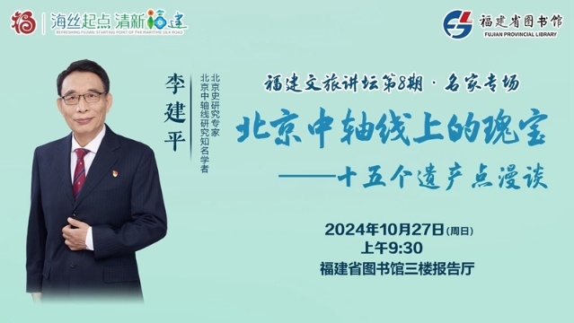 福建文旅講壇第8期·名家專場“北京中軸線上的瑰寶——十五個遺產(chǎn)點漫談”專題講座活動將于10月27日上午在福建省圖書館舉辦。[詳細]