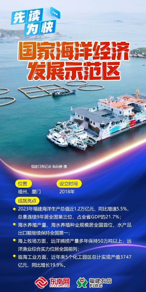 多年來,福建充分發(fā)揮海洋資源的獨特優(yōu)勢,推出一批有特色、具實效的舉措,掀起了一股逐夢“深藍(lán)”的強勁浪潮。數(shù)據(jù)顯示,2023年福建海洋生產(chǎn)總值近1.2萬億元,同比增速5.5%,總量連續(xù)9年居全國第三位,占全省GDP的21.7%;水產(chǎn)品總產(chǎn)量890萬噸,居全國前三;海水養(yǎng)殖產(chǎn)量、海水養(yǎng)殖種業(yè)規(guī)模居全國首位,水產(chǎn)品出口額繼續(xù)保持全國第一。[詳細(xì)]