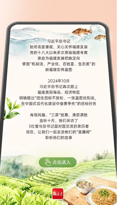 2024年10月15日至16日,習近平總書記再次親臨福建考察,作出重要指示。一年來,我省廣大干部群眾按照總書記擘畫的宏偉藍圖,錨定目標、扎根崗位,實干擔當、奮勇爭先,以實實在在的工作成效譜寫中國式現代化福建篇章。[詳細]