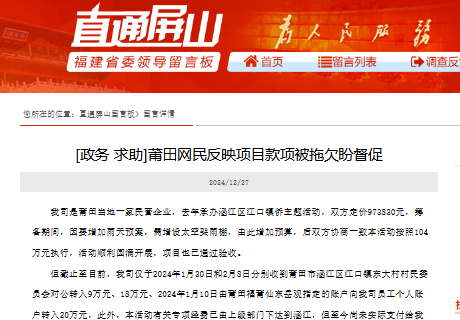 近日,莆田一企業(yè)在《直通屏山》反映,其于2023年承辦涵江區(qū)江口鎮(zhèn)某主題文化活動,至今仍有57萬元經費未結清,導致供應商貨款、工人工資及員工薪酬長期拖欠。